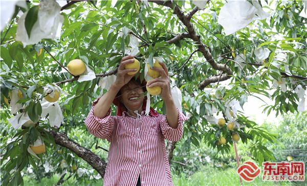 果農(nóng)正在采摘黃桃 饒麗英 攝