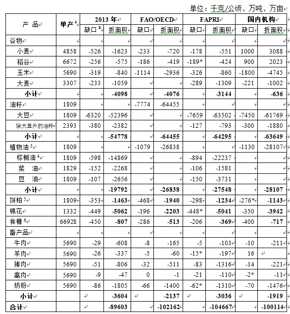 2012年FAPRI預測,到2020年我國小麥、玉米缺口分別為178萬噸、326萬噸;大豆和豆油缺口分別為7659萬噸和150萬噸;油菜籽、菜籽粕和菜籽油缺口分別為127萬噸、150萬噸和106萬噸;棕櫚油缺口為894萬噸;食糖缺口為206萬噸;牛肉、豬肉、禽肉缺口分別為4.9萬噸、83.2萬噸和20.9萬噸。FAPRI的預測中沒有大米、棉花和奶粉的預測數(shù)據(jù),如果假設這些產(chǎn)品2020年缺口基本保持目前的凈進口水平,其預測的我國主要農產(chǎn)品缺口也相當于10億畝左右耕地播種面積的產(chǎn)出。