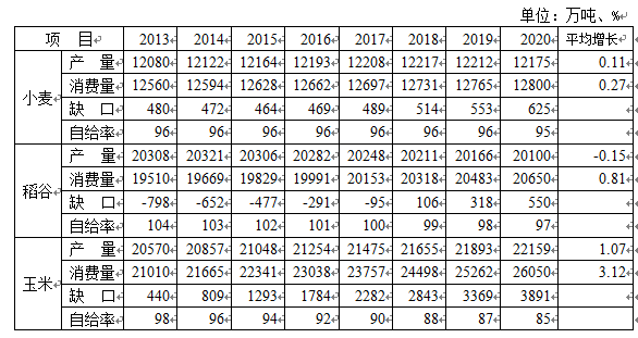 2.國內有關部門及研究機構的預測結果。農業(yè)部發(fā)展計劃司“根據(jù)食物營養(yǎng)標準及人口總量”、“根據(jù)近5年糧食食用消費增長和未來飼料用糧需求趨勢”以及“根據(jù)分品種需求增長趨勢”3種不同測算方法對2020年我國糧食需求進行了預測。預計2020年我國糧食需求總量在7.2億噸左右,比2011年的5.7億噸增加1.5億噸,年均增加近1650萬噸。其中,水稻、小麥和玉米三大谷物消費總量約5.95億噸,大豆9000萬噸,雜糧3500萬噸。三大谷物中水稻需求為2.065億噸、小麥1.28億噸、玉米2.605億噸。同時,基于對中國科學院、中國農業(yè)大學、中國糧油食品(集團)有限公司等預測結果的綜合分析,預計2020年棉花、油料(不含大豆)、食糖消費均呈增加態(tài)勢,消費總量將分別達到1000萬噸、3860萬噸、1700萬噸。