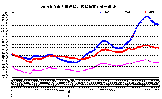 生豬價(jià)格。全國(guó)活豬平均價(jià)格18.62元/公斤,與前一周持平,與去年同期相比(簡(jiǎn)稱(chēng)同比,下同)上漲2.3%?;钬i價(jià)格上漲省份17個(gè),持平省份1個(gè),下降省份12個(gè)。西北地區(qū)活豬平均價(jià)格較高,為19.23元/公斤;東北地區(qū)較低,為17.77元/公斤。全國(guó)豬肉平均價(jià)格29.7元/公斤,與前一周持平,同比上漲4.8%。豬肉價(jià)格上漲省份13個(gè),持平省份3個(gè),下降省份14個(gè)。西南地區(qū)豬肉平均價(jià)格較高,為30.34元/公斤;東北地區(qū)較低,為28.6元/公斤。全國(guó)仔豬平均價(jià)格46.9元/公斤,比前一周下降0.4%,同比上漲34.9%。仔豬價(jià)格上漲省份8個(gè),持平省份2個(gè),下降省份20個(gè)。