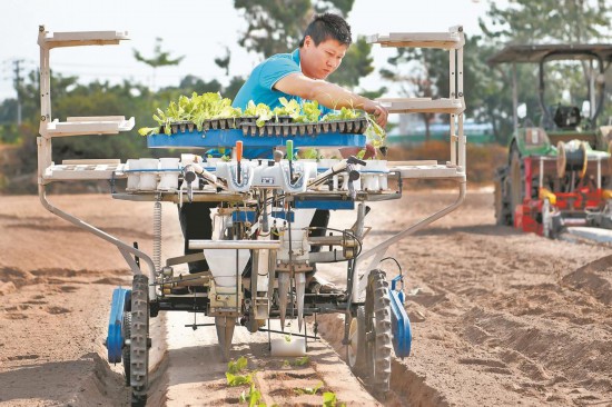 10月31日,在泉州市惠安縣盛豐農(nóng)場內(nèi),工作人員正在操作一臺乘坐式雙行蔬菜移栽機(jī)進(jìn)行結(jié)球蔬菜移栽。據(jù)了解,該移栽機(jī)只需一名操作人員放苗,作業(yè)效率3600株/小時(shí),超過6個(gè)熟練工人工定植的效率。