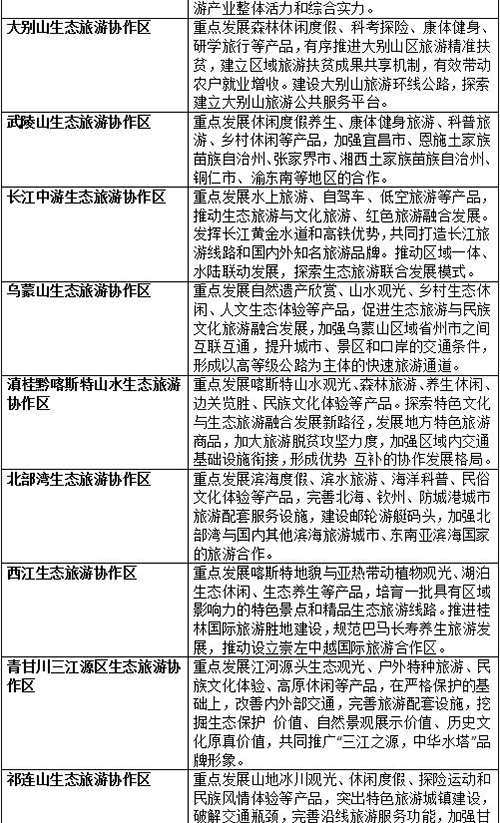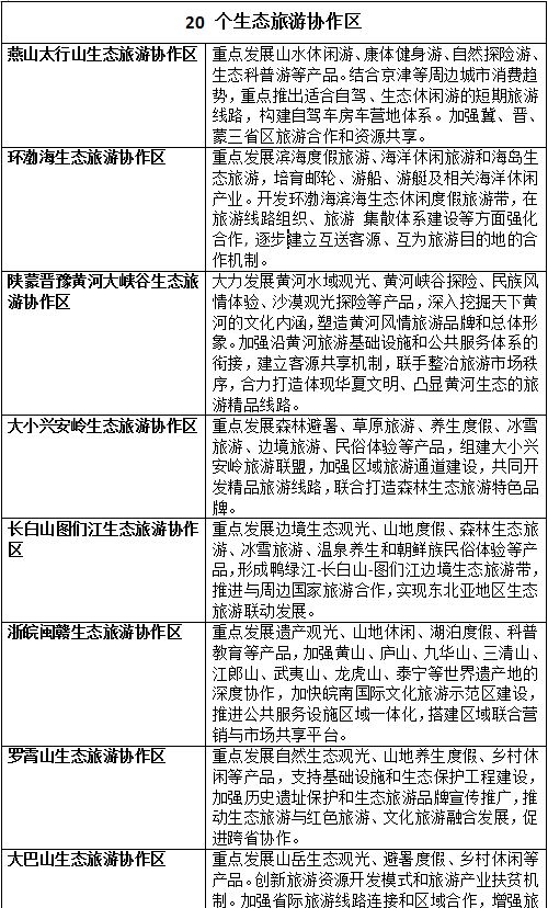同時(shí),《規(guī)劃》還提出了幾項(xiàng)重點(diǎn)任務(wù),要求依據(jù)生態(tài)旅游資源、交通干線和節(jié)點(diǎn)城市分布,在八大生態(tài)旅游片區(qū)基礎(chǔ)上,以重要生態(tài)功能區(qū)為單元,培育20個(gè)生態(tài)旅游協(xié)作區(qū),遴選一批有代表性的生態(tài)旅游目的地,通過提升基礎(chǔ)設(shè)施和公共服務(wù)水平,建設(shè)200個(gè)重點(diǎn)生態(tài)旅游目的地,按照生態(tài)要素的線性分布和旅游線路組織的基本原則,形成50條跨省和省域精品生態(tài)旅游線路,適應(yīng)日益興起的自駕車和房車旅游,結(jié)合國家整體路網(wǎng)布局,打造 25條國家生態(tài)風(fēng)景道,形成點(diǎn)線面相結(jié)合、適應(yīng)多樣化需求的生態(tài)旅游發(fā)展格局。