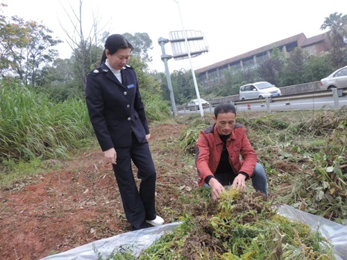11月初,大橫林業(yè)站人員外出巡查時發(fā)現(xiàn)浦南高速延平北高速路口處有外形艷麗,形似“加拿大一枝黃花”的植物,經(jīng)核實,該植物確屬“加拿大一枝黃花”。該地塊面積約5畝,按照除治要求,迅速組織防治專業(yè)隊先摘除花序,砍掉地上莖桿,挖出地下根莖,曬干后采取集中焚燒防治方法進(jìn)行了銷毀。(圖文/何小敏)