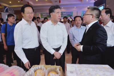 9月7日上午,中共中央政治局委員、國(guó)務(wù)院副總理汪洋在農(nóng)業(yè)部部長(zhǎng)韓長(zhǎng)賦等陪同下,參觀在江蘇省蘇州市舉辦的新農(nóng)民創(chuàng)業(yè)創(chuàng)新百佳成果展。圖為汪洋副總理在蘇寧易購(gòu)展臺(tái)前與工作人員交談,了解企業(yè)發(fā)展農(nóng)產(chǎn)品電子商務(wù)情況。本報(bào)葉曉寧攝 |