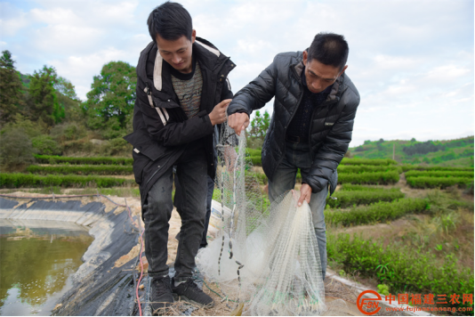 徐智順(右)在蝦試養(yǎng)基地里整理抓蝦的魚網(wǎng)
