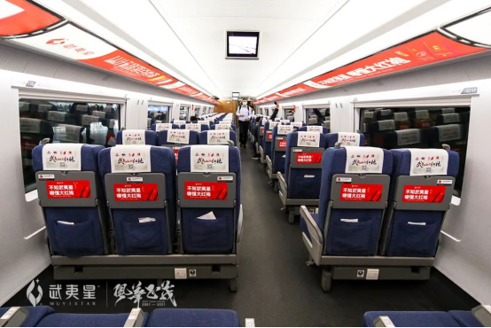 從入口到車(chē)門(mén)、無(wú)論是小桌板還是行李架,隨處可見(jiàn)的海報(bào)、創(chuàng)意貼紙,將武夷星的品牌形象立體地呈現(xiàn)在乘客眼前,每一部冠名列車(chē),就像是武夷星向全國(guó)各地發(fā)出的“大紅袍”的名片。