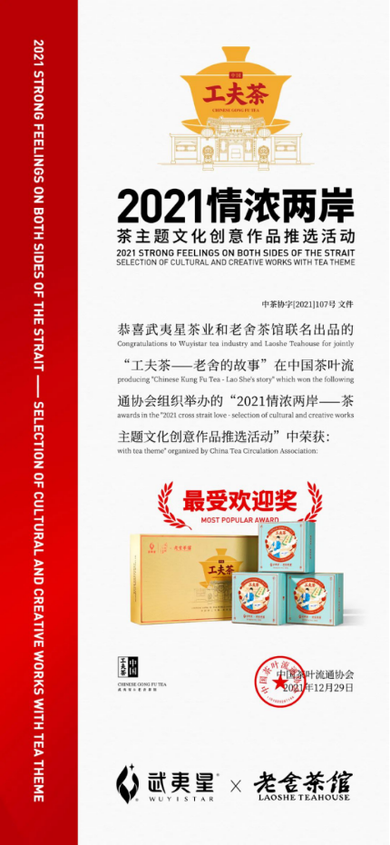 近日,我會會員單位武夷星茶業(yè)有限公司的產(chǎn)品“工夫茶·老舍的故事”,在中國茶葉流通協(xié)會組織舉辦的“2021情濃兩岸—茶主題文化創(chuàng)意作品推選活動”中,獲得了“最受歡迎獎”。