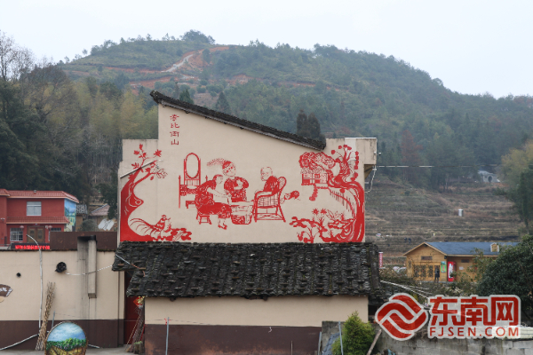圖為村內(nèi)隨處可見的剪紙墻繪。東南網(wǎng) 周濤 攝