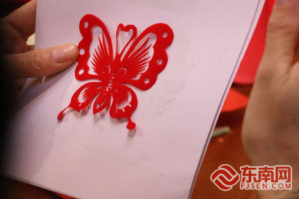 當(dāng)金素清將手中的剪紙展開時,一只巴掌大的蝴蝶剪紙展現(xiàn)在眾人面前,仔細(xì)一看,只有指甲蓋大小的蝴蝶腹部居然有一個“壽”字,如此巧奪天工,引得眾人陣陣驚呼。