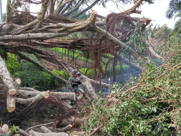 第14號超強(qiáng)臺風(fēng)“莫蘭蒂”9月15日凌晨在廈門登陸后,按照福建省政府領(lǐng)導(dǎo)指示要求,當(dāng)天傍晚,福建省林業(yè)廳緊急組調(diào)集全省國有林場專業(yè)技術(shù)人員230人,攜帶100多臺油鋸,組成搶險救災(zāi)突擊隊(duì),在廳黨組成員、副廳長劉亞圣帶領(lǐng)下,趕赴廈門市區(qū)開展道路清理工作。截止17日18點(diǎn),共清理城區(qū)道路31公里,清理倒伏損毀樹木3844株,清理行道樹損毀樹枝等廢棄物約2000立方米。救援隊(duì)員發(fā)揚(yáng)一不怕苦、二不怕累的精神,早晨6點(diǎn)即投入現(xiàn)場救援,一天連續(xù)工作12個小時以上,展現(xiàn)了國有林場職工精湛嫻熟的專業(yè)水平、快速高效的作業(yè)能力以及吃苦耐勞的精神風(fēng)貌。