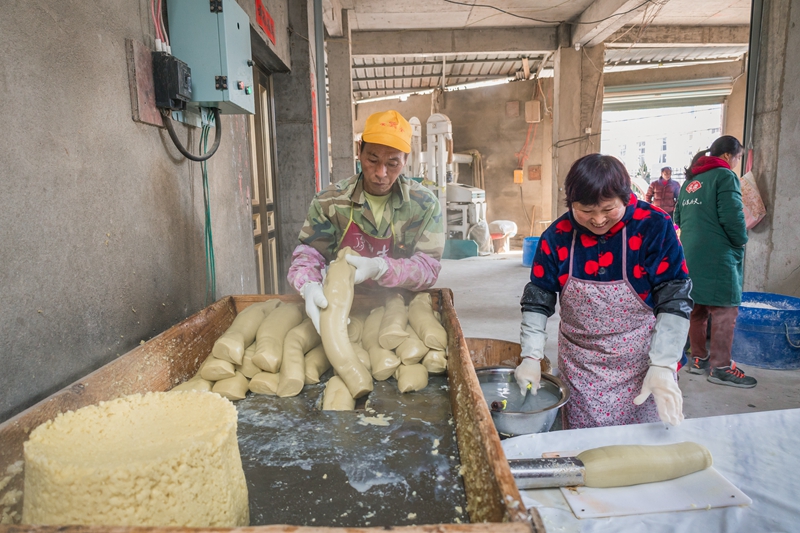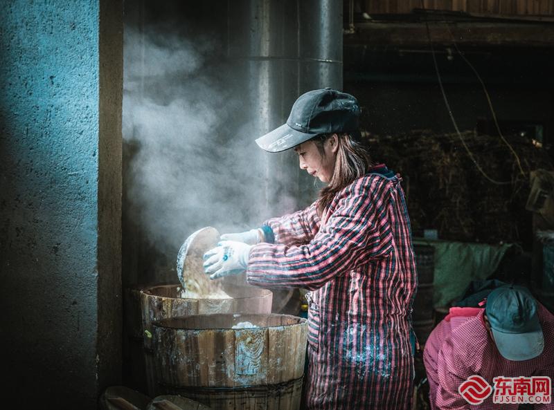 跟隨楊敬代的腳步,筆者來到村里的一處加工坊,由于臨近過年,這里一派熱火朝天的景象,村民都聚集在這準(zhǔn)備制作黃粿。在加工坊里,工人忙著把泡好的糯米研磨成粉,再放入攪拌機(jī)內(nèi)倒入灰堿水?dāng)嚢杈鶆?,讓糯米粉與灰堿水充分融合,糯米粉盈滿金黃的色澤,將其裝入飯甑蒸熟。經(jīng)過這一道道工序,淡淡的堿水味在空氣中縈繞,熟悉的味道慢慢浮現(xiàn)。蒸熟的糯米粉經(jīng)過機(jī)器反復(fù)壓制成型,清香柔韌,口感軟糯經(jīng)過切割、分裝,黃粿的制作才算告一段落。