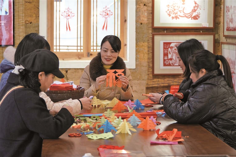 鄉(xiāng)村熱鬧,村民生活紅火?!耙郧?,我和丈夫都在柘榮城關(guān)打零工,顧不上老人和小孩。如今回到村里,參與到剪紙培訓(xùn)、剪紙創(chuàng)作、農(nóng)家樂(lè)餐飲服務(wù)中,每個(gè)月收入有近2000元,比在外面打工強(qiáng)多了?!贝迕駨堁┗ㄐχf(shuō)。
