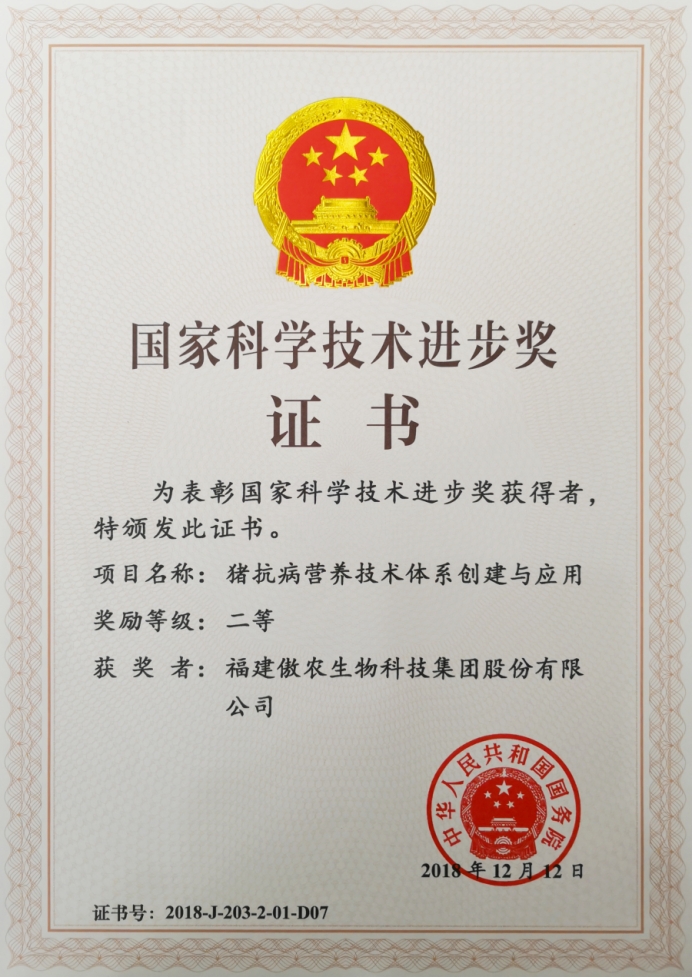 集團(tuán)主導(dǎo)、參與的科研項(xiàng)目先后榮獲國(guó)家科學(xué)技術(shù)進(jìn)步獎(jiǎng)二等獎(jiǎng)、全國(guó)農(nóng)林牧漁一等獎(jiǎng)、四川省科學(xué)技術(shù)進(jìn)步獎(jiǎng)一等獎(jiǎng)、湖南省技術(shù)發(fā)明一等獎(jiǎng)等重量級(jí)獎(jiǎng)項(xiàng)。優(yōu)質(zhì)榮譽(yù)資質(zhì)的持續(xù)積累,為傲農(nóng)科研創(chuàng)新實(shí)力的持續(xù)提升創(chuàng)造了有利條件,也為傲農(nóng)事業(yè)發(fā)展奠定了堅(jiān)實(shí)基礎(chǔ)。