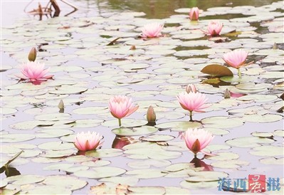 在現(xiàn)場看到,上百朵睡蓮從水中探出頭來,在綠葉簇擁下爭相綻放,美不勝收。放眼望去,朵朵粉色睡蓮亭亭玉立,碧波映襯下,仿佛讓人走進夢幻般的“莫奈花園”。時不時有一些水鳥、蜻蜓穿梭于花叢之間,經過的市民游客或靜靜觀賞,或拿出手機定格下這一幅幅美好畫面,或擺個造型與睡蓮來張合影。