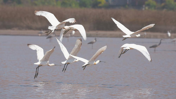 5日,霞浦縣松山街道福寧灣迎來60多只黑臉琵鷺和白臉琵鷺,它們停留在福寧灣內(nèi)的近岸灘涂,或嬉戲,或覓食,或在低空自由飛翔,場面壯觀而溫馨。