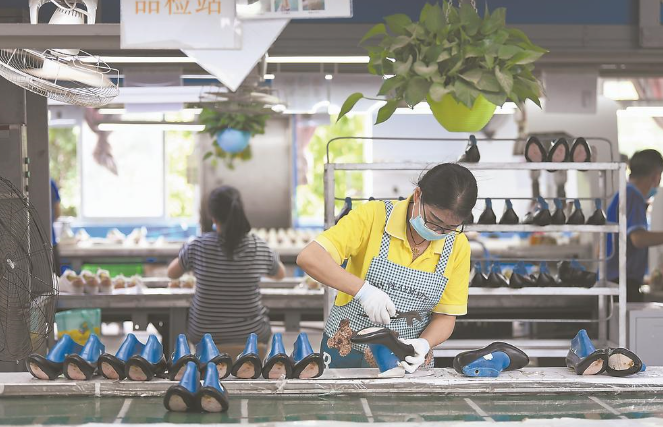 25日,在福州市倉山區(qū)一家鞋企生產(chǎn)線上,工人在檢驗將要出口的皮鞋。當?shù)赝ㄟ^落實各項惠企政策,進一步加大助企紓困力度。我省堅持“動態(tài)清零”總方針不動搖,積極出臺多項政策舉措,穩(wěn)定市場主體,助力有序生產(chǎn)。(王旺旺 攝影報道)