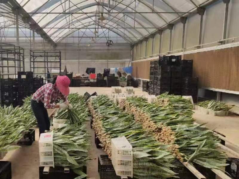 工人正在對收購來的虎皮蘭進行清洗、消毒與分級