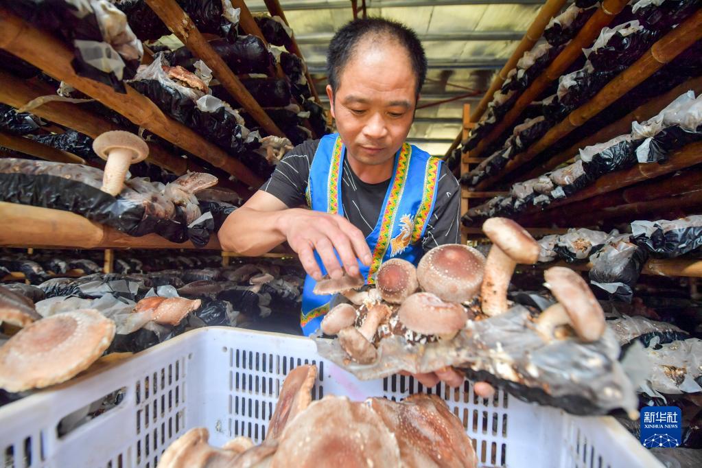 畬鄉(xiāng)村民雷興福正在采菇。(新華社 王成攝)