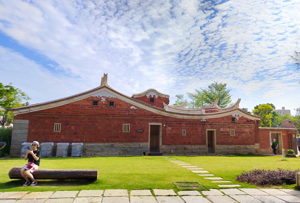 5月19日,游客在梧林村閩南紅磚古厝前游玩。新華社周義 攝