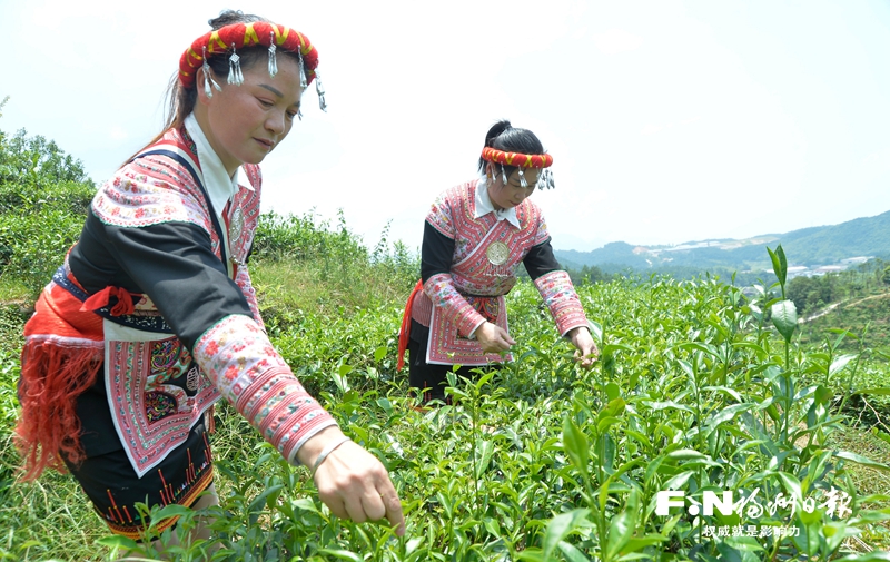 身著畬族服裝的村民在七境茶場采茶。記者 鄭帥 攝