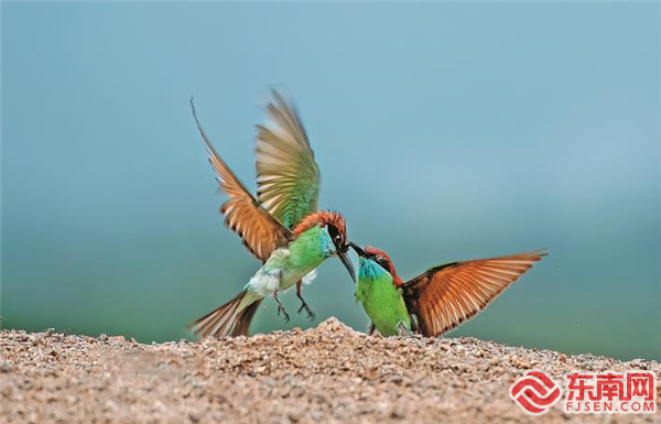 藍(lán)喉蜂虎在沙地“洗澡”。