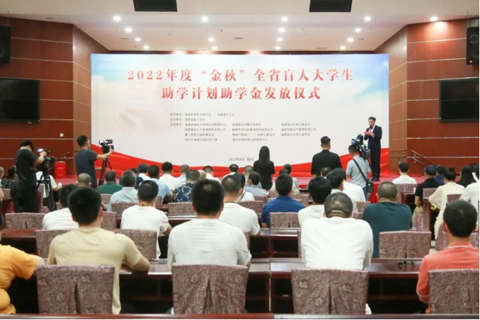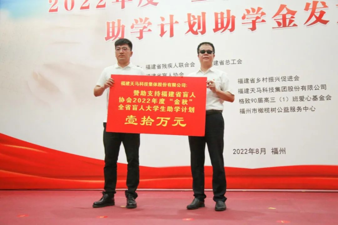 8月29日,由福建省殘疾人聯(lián)合會(huì)與福建省總工會(huì)共同指導(dǎo)、福建省盲人協(xié)會(huì)主辦的福建省盲人協(xié)會(huì)2022年度“金秋”全省盲人大學(xué)生助學(xué)計(jì)劃助學(xué)金發(fā)放儀式在福建省殘疾人體育運(yùn)動(dòng)管理中心舉行。福建省政協(xié)黨組成員、副主席、省鄉(xiāng)村振興促進(jìn)會(huì)會(huì)長(zhǎng)許維澤,福建省政協(xié)社法委副主任嚴(yán)效東,福建省總工會(huì)黨組成員、副主席黃愛(ài)華,福建省殘聯(lián)黨組成員、副理事長(zhǎng)鄭海生,天馬科技集團(tuán)副董事長(zhǎng)、執(zhí)行總裁陳加成,總裁助理闕川博等出席儀式?;顒?dòng)中,我會(huì)副會(huì)長(zhǎng)單位福建天馬科技集團(tuán)股份有限公司執(zhí)行總裁陳加成代表集團(tuán)捐資10萬(wàn)元,支持2022年度“金秋”福建省盲人大學(xué)生助學(xué)計(jì)劃。