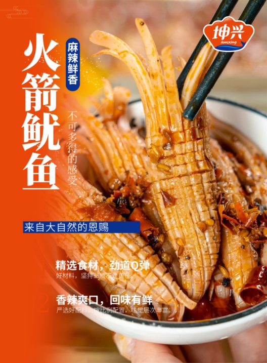 坤興香辣魷魚,精選深海大個魷魚,搭配多種調(diào)料制做而成,香辣勁道過癮。產(chǎn)品Q彈營養(yǎng),肉質(zhì)醇香,爽脆加倍,保留大魷魚的鮮美,省時即食,干凈衛(wèi)生,可放心食用。