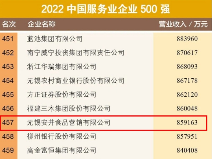 我會常務理事單位安井食品集團股份有限公司旗下無錫安井食品營銷有限公司(下稱“安井營銷”)首度入榜,位列中國服務業(yè)企業(yè)第457位。