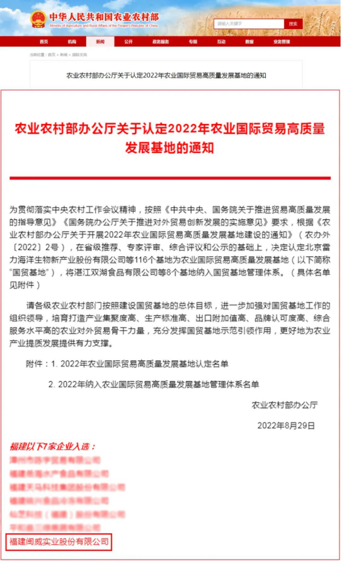 近日,農(nóng)業(yè)農(nóng)村部正式發(fā)布了《關(guān)于認(rèn)定2022年農(nóng)業(yè)國際貿(mào)易高質(zhì)量發(fā)展基地的通知》,我會理事單位福建閩威實業(yè)股份有限公司打造以“水產(chǎn)養(yǎng)殖為基礎(chǔ),以種苗繁殖為重點,以深加工產(chǎn)品為核心”的全產(chǎn)業(yè)鏈發(fā)展布局,助力現(xiàn)代農(nóng)業(yè)轉(zhuǎn)型升級,被認(rèn)定為2022年度農(nóng)業(yè)國際貿(mào)易高質(zhì)量發(fā)展基地。