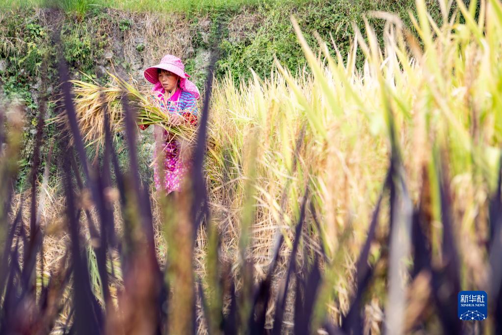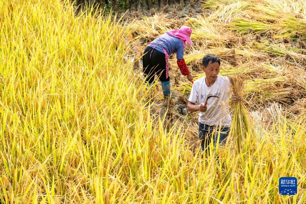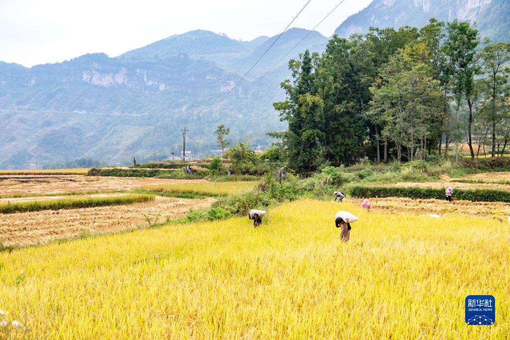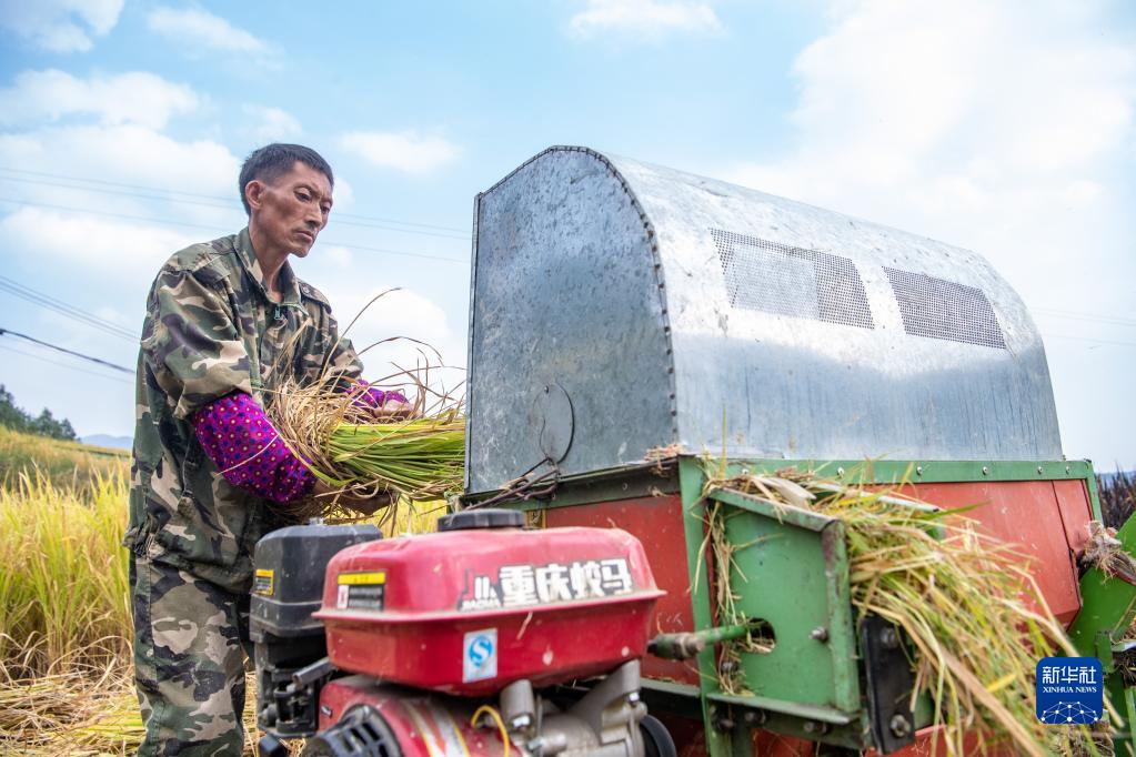 9月14日,在重慶市酉陽(yáng)土家族苗族自治縣花田鄉(xiāng),稻農(nóng)在稻田里搶收稻谷。