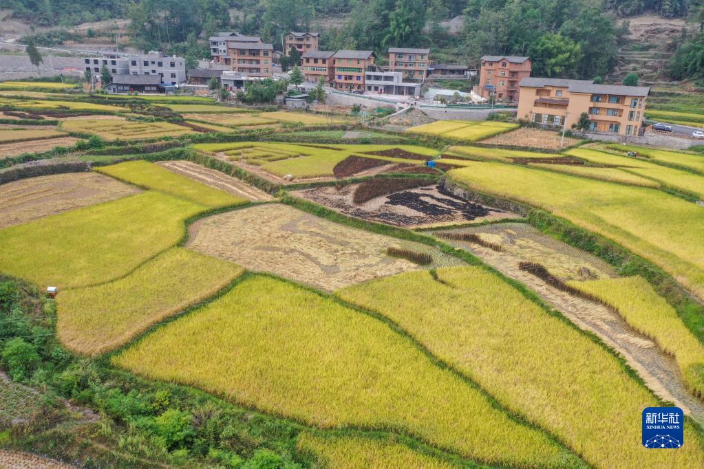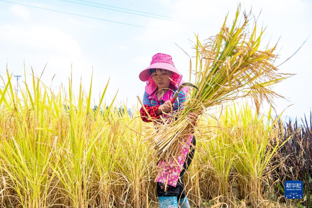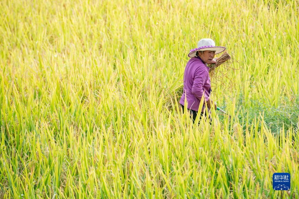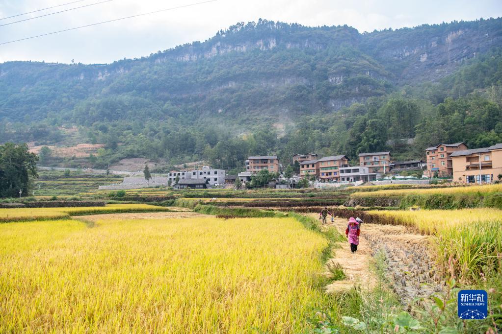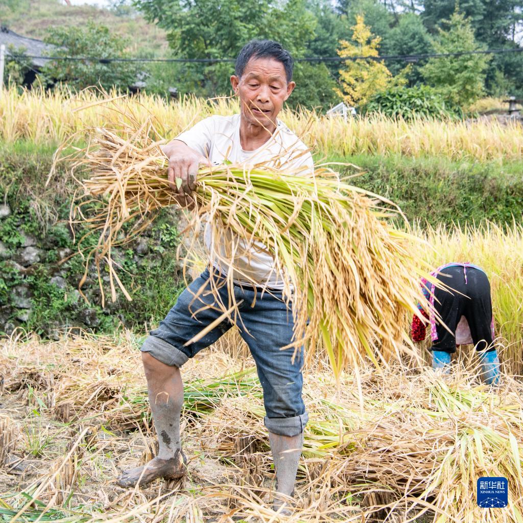 9月14日,在重慶市酉陽(yáng)土家族苗族自治縣花田鄉(xiāng),稻農(nóng)在稻田里搶收稻谷。