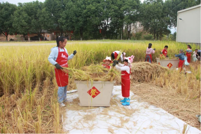 在最有趣的體驗(yàn)環(huán)節(jié),小朋友們看到金黃金黃的水稻,立即分頭行動(dòng)起來(lái),幾人一組,弓腰開(kāi)鐮,下田體驗(yàn)收割水稻。鐮刀一揮一舞間,滿是收獲的快樂(lè),這是孩子們第一次體驗(yàn)收割稻子,每個(gè)人都興趣高漲。在專業(yè)人員和帶隊(duì)老師的指導(dǎo)下,他們完成了人生第一次收割稻谷。每個(gè)孩子的臉上都洋溢著收割稻谷的喜悅,有的孩子割了一大捧都抱不動(dòng)了還想繼續(xù)割;還有的孩子割完稻子后琢磨著怎樣剝出米粒。