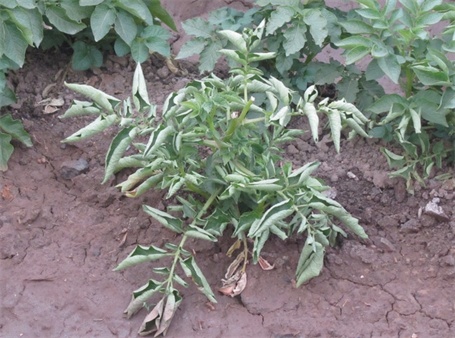 有經(jīng)驗(yàn)的菜農(nóng)都知道,如果在茄子上噴施了一次含代森錳鋅的農(nóng)藥后,本來綠油油的葉片就變得暗淡無光了,植株中下部葉片也變老發(fā)黃,有的是葉脈發(fā)黃,若連續(xù)使用多次會(huì)造成嚴(yán)重落葉。究其原因是該農(nóng)藥中含有大量的錳元素,茄子對(duì)錳又特別敏感,噴施后錳元素在葉部造成積累,以致于錳過剩,輕者葉片發(fā)黃,重者自上而下開始落葉。凡是含代森錳鋅的都有這方面的副作用,如殺毒礬、速克凈,雷多米爾、安克·錳鋅,克露、大生、大生-M45、新萬生、山德生等。因此,一旦發(fā)現(xiàn)茄子黃葉現(xiàn)象,首先考慮是噴用代森錳鋅造成的,應(yīng)立即停止,再用愛多收6000倍混加細(xì)胞分裂素600倍混合云大120葉面噴施解決。本來在茄子上使用殺菌劑應(yīng)以百菌清為主。因?yàn)榘倬鍖匐骖悮⒕鷦鰤A、酸而穩(wěn)定,對(duì)多種病原菌都有保護(hù)和預(yù)防作用,可防治茄果類的早疫病,晚疫病、灰霉病、斑枯病、炭疽病、綿疫病等多種病害。如果和DT或甲霜銅混合使用或間隔交替使用,即可防治茄子的多種病害。