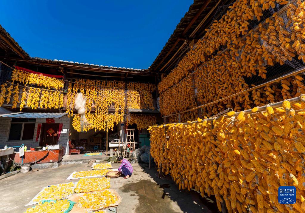 11月29日,漳州市南靖縣梅林鎮(zhèn)梅林村村民在自家小院里晾曬玉米。(張旭 攝)