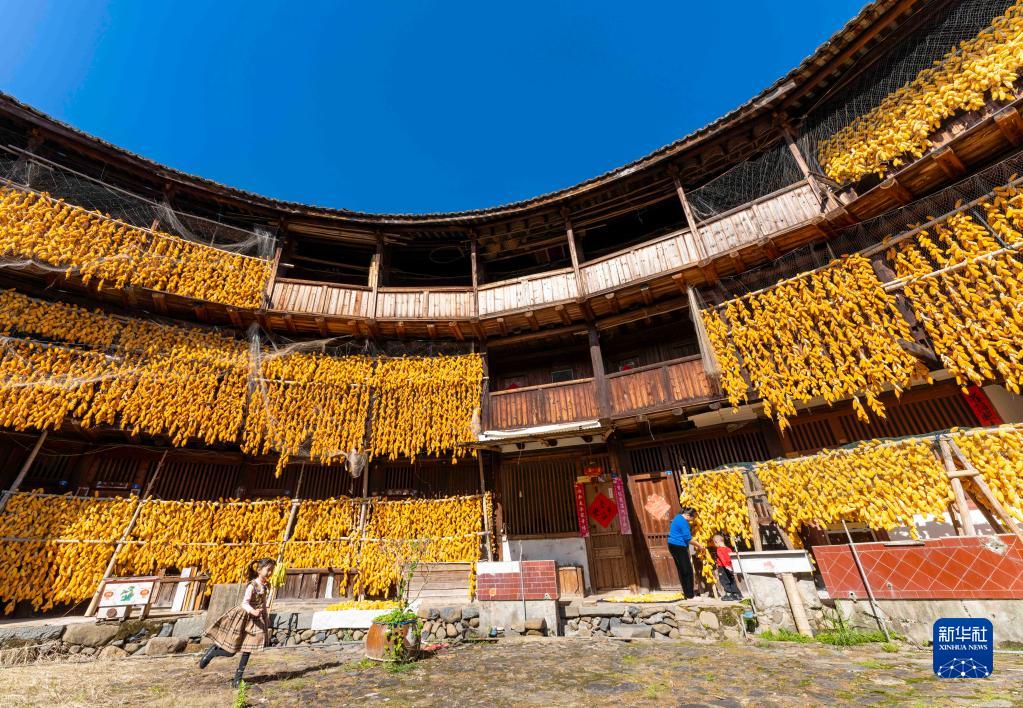 11月29日,漳州市南靖縣梅林鎮(zhèn)梅林村村民在土樓里晾曬玉米。