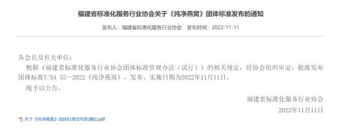 《純凈燕窩》團(tuán)體標(biāo)準(zhǔn)正式公布
