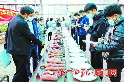 紅肉、黃肉、紫肉……不同品種的甘薯或蒸熟,或烤熟,同場“PK”,接受統(tǒng)一“考試”。日前,一場別開生面的鮮食甘薯品種觀摩會在廈門海峽農業(yè)高新技術園舉行。黃金薯3號、黃金薯1號、龍紫195從參評的14個品種中脫穎而出,我市將在明年向全市種植戶推廣種植,進一步優(yōu)化我市糧食品種結構,提高甘薯品質和附加值。