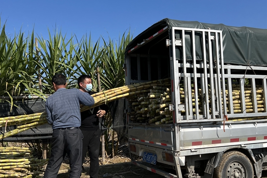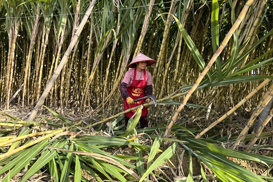 農(nóng)民在甘蔗地里忙碌砍收甘蔗