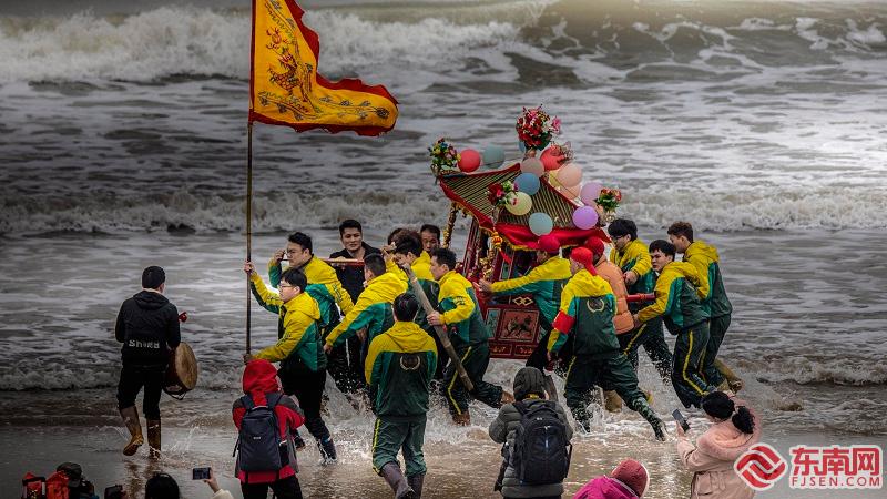 當(dāng)天中午開始,一頂頂轎子魚貫而出,延村子繞境巡安一圈后聚集在寬闊的海灘上。而后,村里的青壯年抬轎沖向大海,踩著海水,在浪花里顛簸搏擊。雖是“料峭春涼水猶寒”,但大家仍然不畏艱難沖海祈福。