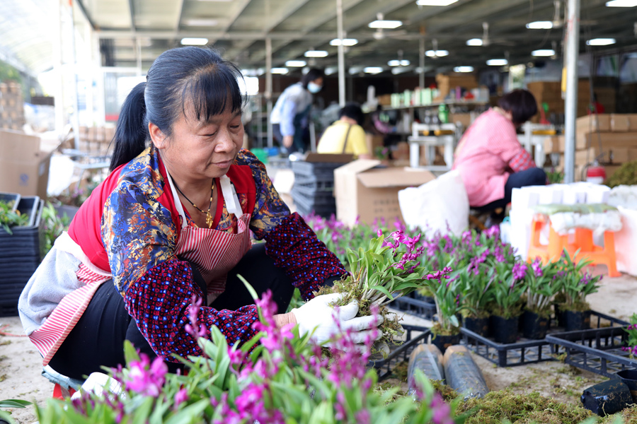 工作人員檢查即將發(fā)往全國各地的蘭花。余祥龍攝
