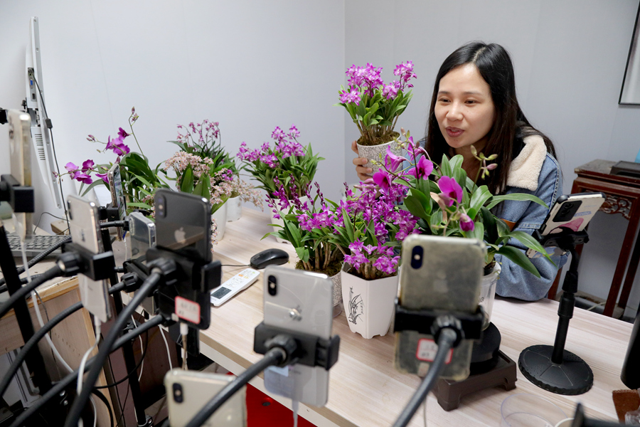 在直播間,主播熱情地推介蘭花。余祥龍攝