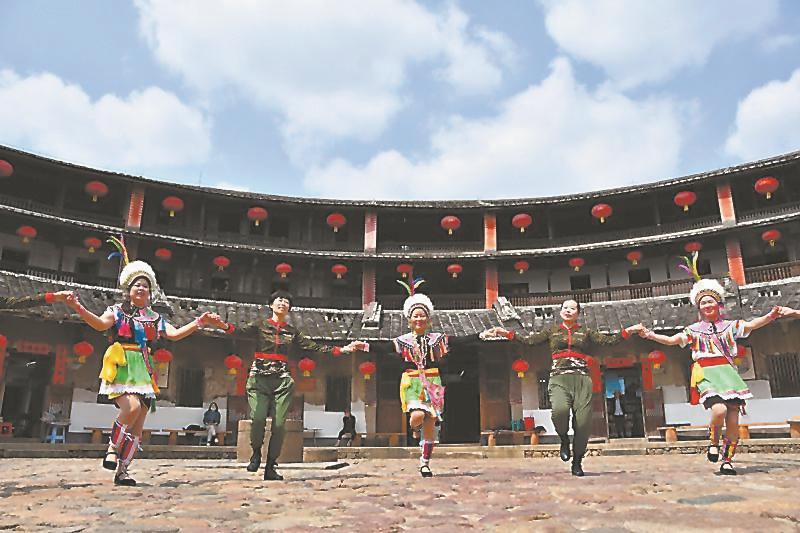 日前,在世界文化遺產(chǎn)華安二宜樓前,一場(chǎng)別開(kāi)生面的“非遺‘云’贈(zèng)軍營(yíng),向一線女軍人致敬”活動(dòng)吸引不少游客駐足觀看。漳州退役女兵和高山族同胞歡聚一堂,并視頻連線部隊(duì)女軍人,共賞非遺文化。