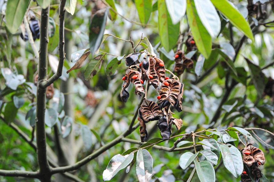 紅豆樹(shù)適生區(qū)狹窄,主要分布于低海拔丘陵、山谷或溪邊常綠闊葉林中,受人類開(kāi)發(fā)干擾嚴(yán)重,種群難以擴(kuò)展。此外,其種子產(chǎn)量低、蟲害嚴(yán)重,結(jié)實(shí)年齡較遲且不穩(wěn)定,需間隔3-5年開(kāi)花結(jié)果1次,甚至更長(zhǎng)時(shí)間,極少連年開(kāi)花結(jié)果,且莢果出種率低、種子難發(fā)芽,野生資源十分稀少,被列為國(guó)家二級(jí)保護(hù)野生植物。