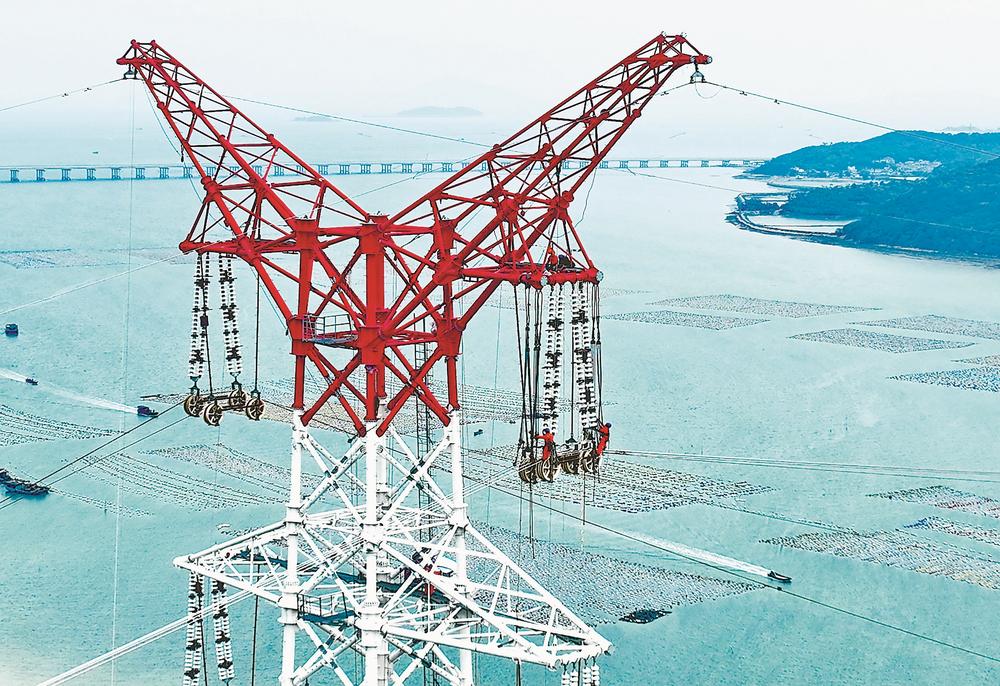 3月31日,在漳州核電500千伏送出工程施工現(xiàn)場(chǎng),施工人員在橫跨1500米的漳江跨越線路百米上空進(jìn)行四回線路同時(shí)跨江作業(yè),全力推進(jìn)工程進(jìn)度。圖為施工人員在電力鋼管塔上作業(yè)。