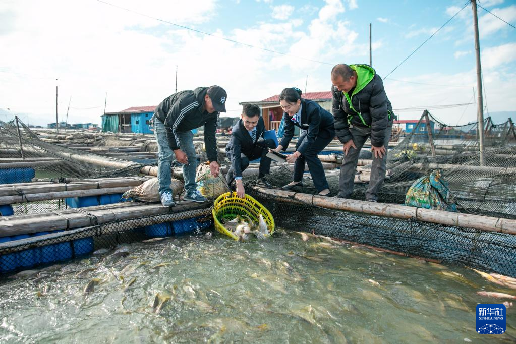 銀行工作人員深入海上漁排了解養(yǎng)殖情況。新華社記者 秦宏 攝