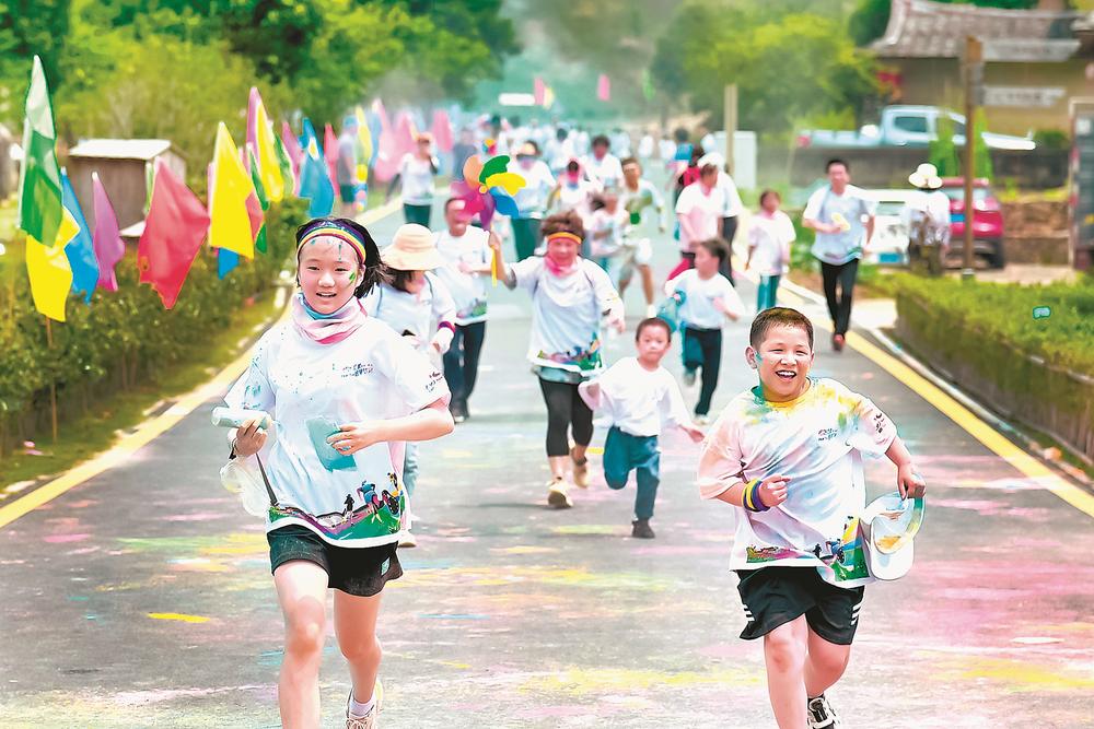 日前,2023年華安土樓彩跑音樂節(jié)在二宜樓前廣場歡樂開跑。當(dāng)日,來自各地的游客身著白色T恤,慢跑在土樓與稻田間,經(jīng)過不同的彩色站時,會被當(dāng)?shù)氐母呱阶骞媚飹伻龆嗖实牟噬勰蜕瞎?jié)日的祝福。