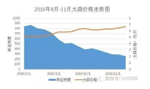 從一畝田平臺(tái)也可以看出,從今年新蒜上市開始,大蒜價(jià)格一直在平穩(wěn)上升,供貨商出貨積極性卻在明顯降低。上周(2016年11月14日-20日),全國(guó)大蒜主產(chǎn)區(qū)平均價(jià)格為6.7元/斤,與上月同期相比價(jià)格上漲8%。 與農(nóng)產(chǎn)品價(jià)格波動(dòng)的主要原因相似,本輪大蒜價(jià)格上漲主要受產(chǎn)地種植面積減少的影響。