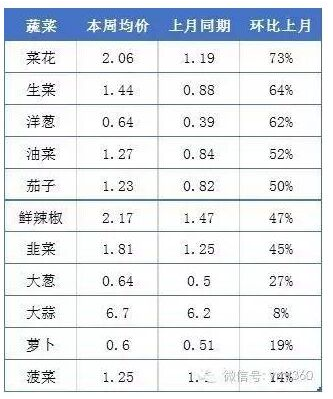 受季節(jié)性因素影響,近期蔬菜價(jià)格的提升幅度較高,其中葉類蔬菜漲幅明顯。其中:菜花本周均價(jià)為2.06元/斤,比上月上漲了73%;生菜本周均價(jià)為1.44元/斤,比上月上漲了64%;洋蔥比上月上漲了62%,油菜比上月上漲了52%。