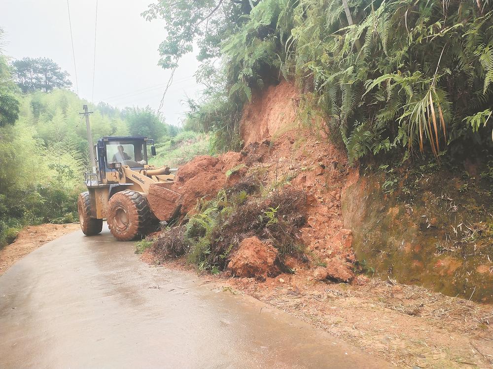 因暴雨影響,德化縣的一些鄉(xiāng)村道路出現(xiàn)溜方等輕微災(zāi)情。圖為7日下午,德化縣龍門灘鎮(zhèn)組織工程車輛清理霞碧村道路溜方。