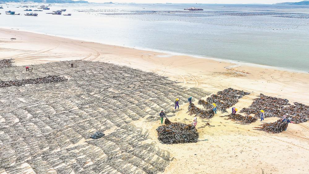 5月,恰逢平潭海帶豐收季。近日,在平潭金井片區(qū)華東村附近沙灘,一片片“海帶田”整齊排列,養(yǎng)殖戶們搶抓晴好天氣采收海帶,待曬干后再進(jìn)行整理、包裝,一幅“海上田園”的豐收畫卷徐徐展開。